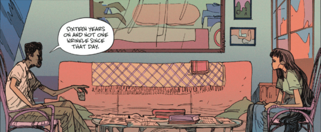 The confrontation between Darius and the titular Laila Starr in chapter four may be one of the best examples of incorporating themes into dialogue that exists in modern comics. The climactic moment encourages introspection on a conceptual level, as it portrays a man haunted by death face-to-face with the physical manifestation of it, naturally causing readers to consider how exactly they view their own mortality and the inevitability of their body’s degradation due to age. In execution, the story beat is just as interesting as the concept, with strong emotions of resentment, suspicion, and hatred teeming throughout. With context, Darius’ simple “Sixteen years on and not one wrinkle since that day” is granted a heap of emotional weight, a verbal representation of his suspicion regarding the true nature of Laila Starr. The subtext is the unsung hero in this moment narratively, just as it is in many of the comic’s conversations, building dialogue around related scenarios and topics to incorporate and expand on the themes. In doing that, The Many Deaths of Laila Starr creates some of the most thematically rich dialogue out there.