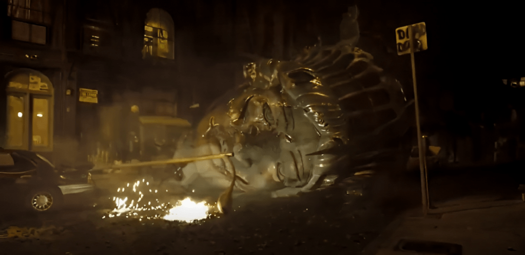 The initial destruction of Manhattan is the inciting incident of the movie, functioning as well as it does because of the cinematography behind it. The dimly lit street subconsciously unsettles viewers; the scale of all the shots used in the moment portrays the characters as vulnerable; and the rapid camera movements make the scene feel frantic and unsafe. Highlighting debris with the shot composition completes the metaphorical puzzle, wordlessly explaining the severity of the situation through that element of cinematography. All together, these elements make Manhattan’s destruction incredibly lifelike, leaving consumers feeling as if they’re witnessing footage of a true natural disaster.